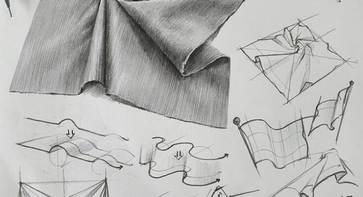 - Practice Flow: Focus on drawing continuous, flowing lines to capture the fabric’s movement, as seen in the flag and drape sketches.