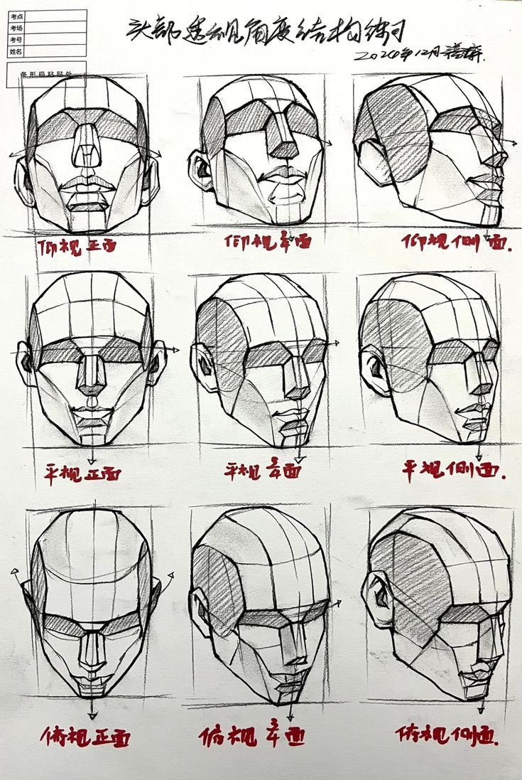 This classic China Academy of Art sketch teaching plan (December 2020 draft) is the gold standard template for head structure and perspective training. It simplifies the complex human head into a planarized plaster cast, systematically presenting 9 standard views (front, three-quarter, profile, low angle, high angle, etc.) to demonstrate: