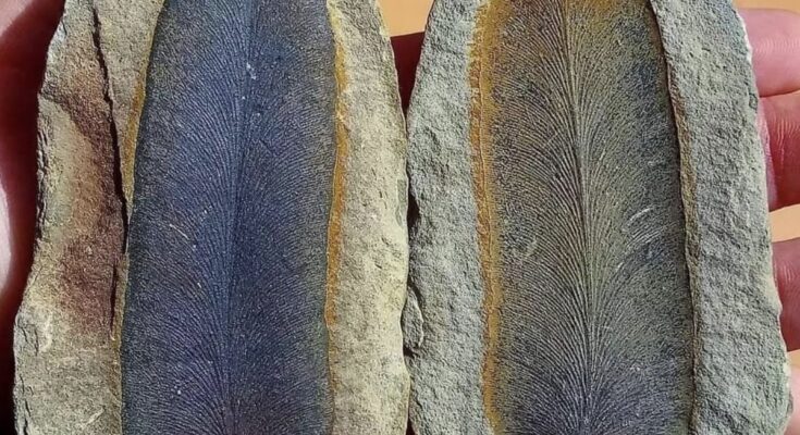 The image showcases a remarkable pair of fossilized bird down feathers from the Eocene epoch, held delicately in a hand to reveal both the positive (part) and negative (counterpart) impressions split from a single slab. Originating from the renowned Green River Formation in Wyoming, USA, these specimens date back approximately 50-52 million years, preserved in fine-grained limestone that captures exquisite details of ancient avian plumage. Down feathers, unlike the structured contour feathers used for flight, served primarily for insulation in early birds, lacking a prominent central shaft (rachis) but featuring soft, fluffy barbs radiating from a basal calamus. This tutorial-style guide explores these fossils step by step, from visual identification and anatomical breakdown to preservation mechanisms, historical context, and their significance in understanding avian evolution. Designed for paleontology enthusiasts, students, or collectors, this post provides a professional resource for analyzing similar compression fossils, whether sourced from commercial sites like eBay or Etsy, or studied in museums such as the Field Museum.