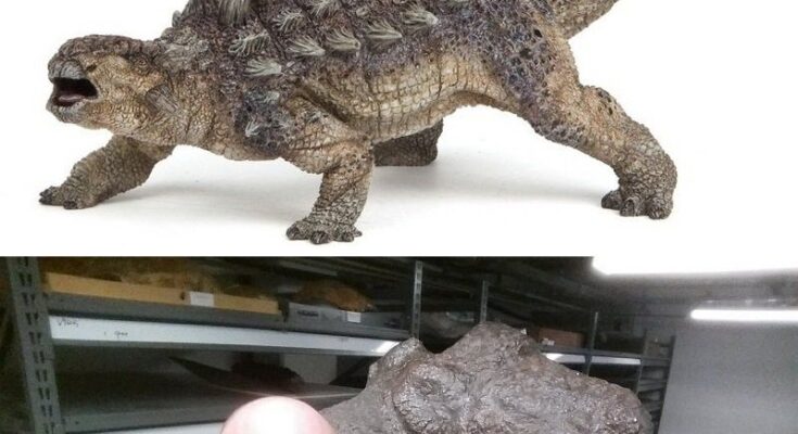 In the lower portion of the image, we see paleontologist Dr. Andrew A. Farke posing with a lightweight cast of an Ankylosaurus tail club at the Raymond M. Alf Museum of Paleontology in Claremont, California. (Note: The museum is often abbreviated as the “Alf Museum,” though sometimes misspelled as “Alpha” in online references.) Dr. Farke, a renowned expert on armored dinosaurs, is shown in a museum storage area, smiling as he easily holds the cast – a replica made from materials like fiberglass or plaster to mimic the original fossil’s shape without its burdensome weight. The real fossilized club would be impossible to lift casually due to its considerable mass, often exceeding 20-50 pounds (9-23 kilograms) after mineralization, combined with its awkward shape and the fragility of ancient bone.