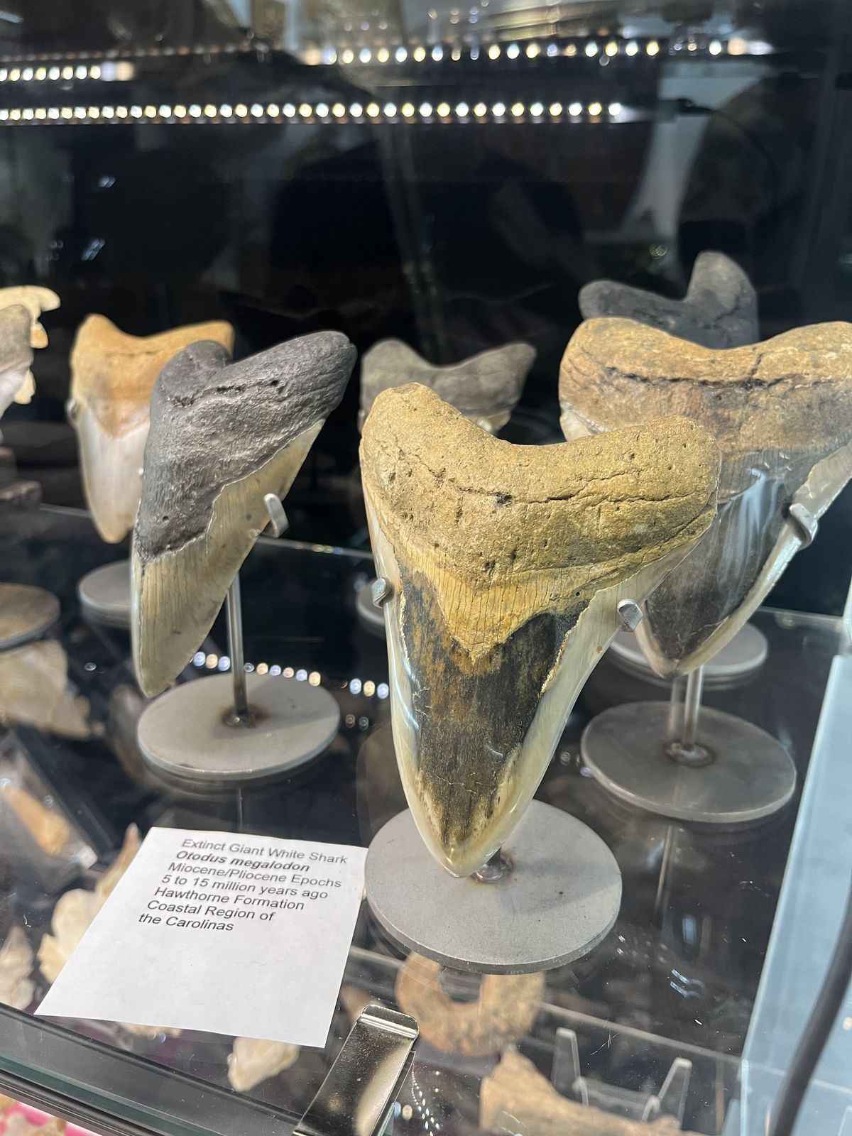 Megalodon teeth are among the most sought-after fossils due to their size, durability, and abundance compared to the shark’s cartilaginous skeleton, which rarely fossilizes. In the image, the teeth range from about 4 to 6 inches (10–15 cm) in slant height, typical of high-quality specimens from the southeastern U.S. The Hawthorne Formation, mentioned on the label, is a Miocene-age geological unit rich in marine fossils, exposed along rivers and coasts in South Carolina and North Carolina.