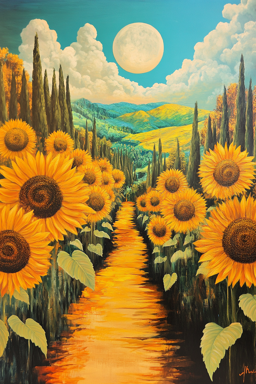 Dive into the realm of surrealism by creating a dreamlike landscape dominated by oversized sunflowers. Incorporate unexpected elements, such as floating sunflowers in the sky or an unusual color palette, to challenge perceptions of reality. This creative freedom will allow you to express your inner thoughts and imagination through art.