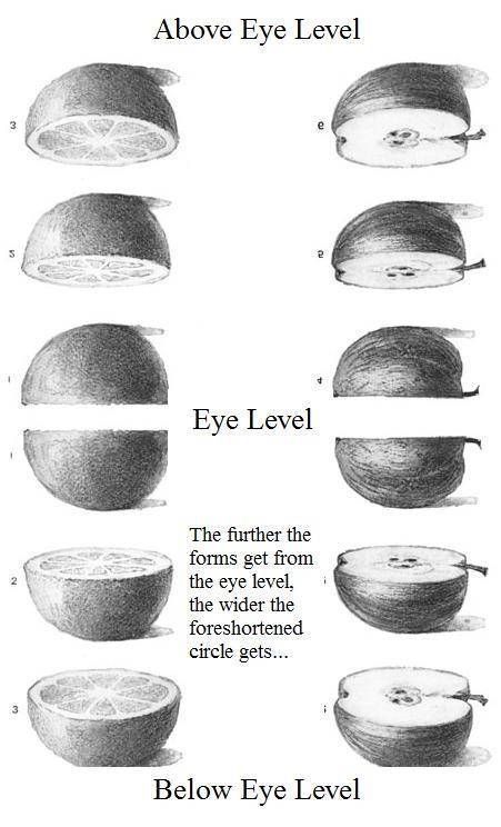 Understanding Perspective in Drawing: How Eye Level Affects Foreshortening and Circular Forms – A Visual Tutorial with Citrus and Apple Halves