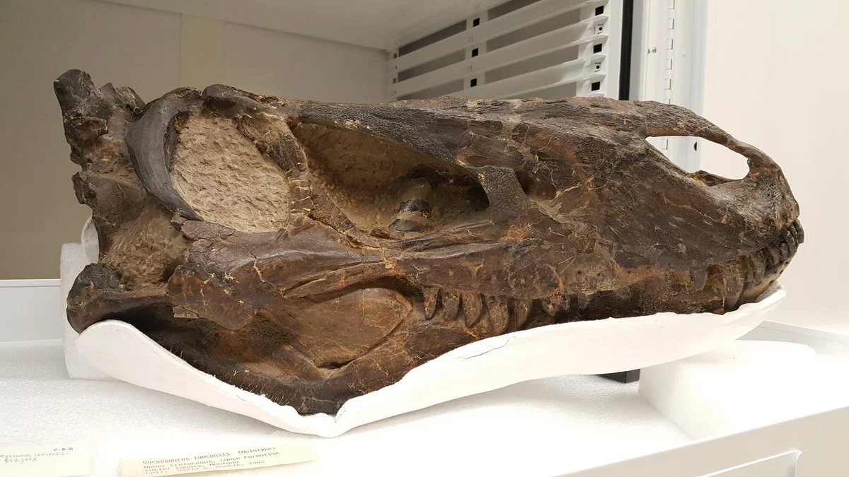 The specimen was collected near Buck Creek, a locality rich in vertebrate fossils, and consists of a nearly complete skull with articulated lower jaws. At the time of discovery, the fossil was embedded in a matrix of fine-grained sandstone and siltstone, requiring careful preparation to reveal its details. Labels associated with the specimen, such as those visible in archival photos, confirm its identification as the holotype of Gorgosaurus lancensis, with notes on its stratigraphic position in the Upper Cretaceous Lance Formation. This step is essential: always verify a fossil’s locality data, as it informs paleoecological reconstructions—here, suggesting a humid, forested environment teeming with prey species that a predator like this might have hunted.