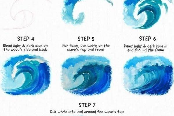 - Gradually dilute the color as you move downward, letting it fade into lighter, brighter blue. This creates instant depth and makes the wave feel like it’s emerging from the sea.