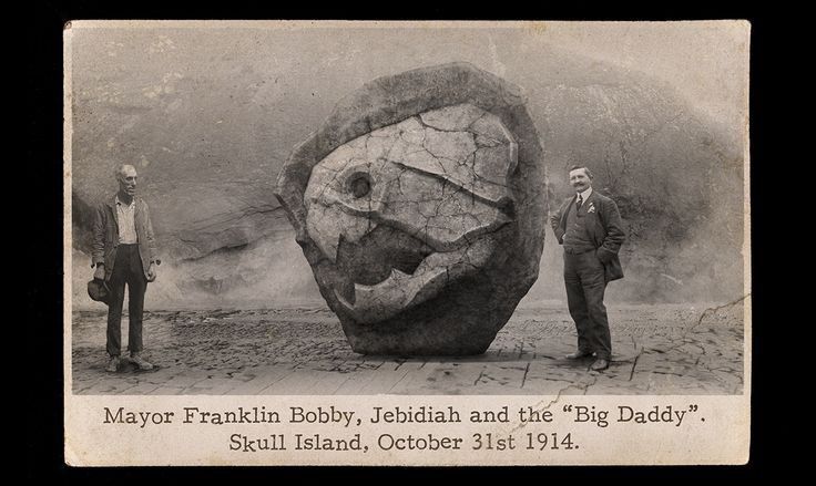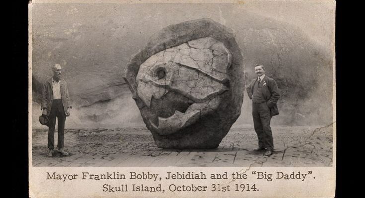 In the golden age of exploration and paleontology (late 19th to early 20th century), sensational discoveries of gigantic fossils frequently captured public imagination, blending genuine science with occasional exaggeration or outright fabrication. This captivating vintage postcard, dated October 31st, 1914, purportedly documents one such find: the colossal fossil skull dubbed “Big Daddy” on the remote and mythical Skull Island, photographed alongside Mayor Franklin Bobby and associate Jebidiah.