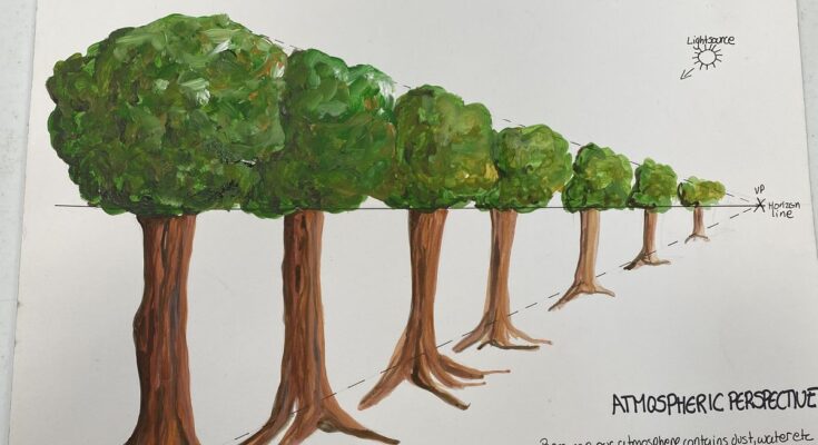 While linear perspective handles size and line convergence, atmospheric perspective explains how distance affects color, value, detail, and clarity due to the Earth’s atmosphere (dust, water vapor, haze).