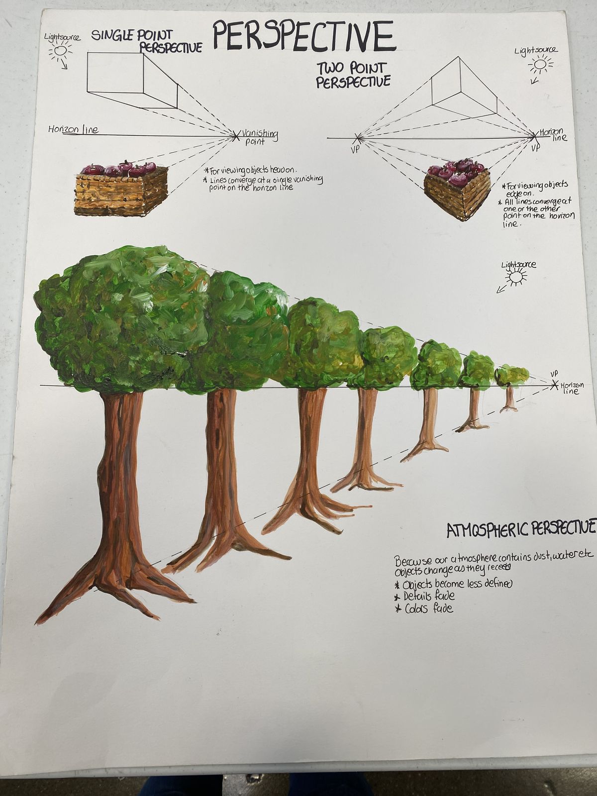 The reference artwork cleverly combines technical diagrams of boxes with a stunning row of receding trees painted in lush greens and browns. It demonstrates how objects appear to diminish in size, detail, and color intensity as they move farther away—perfect for landscapes, cityscapes, still lifes with depth, and any scene requiring convincing spatial recession.