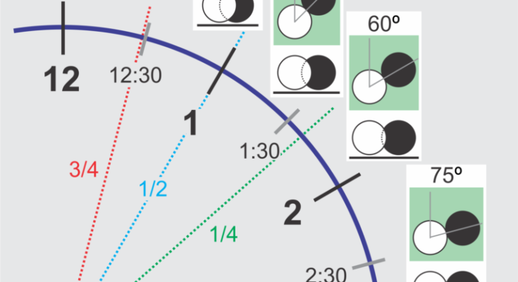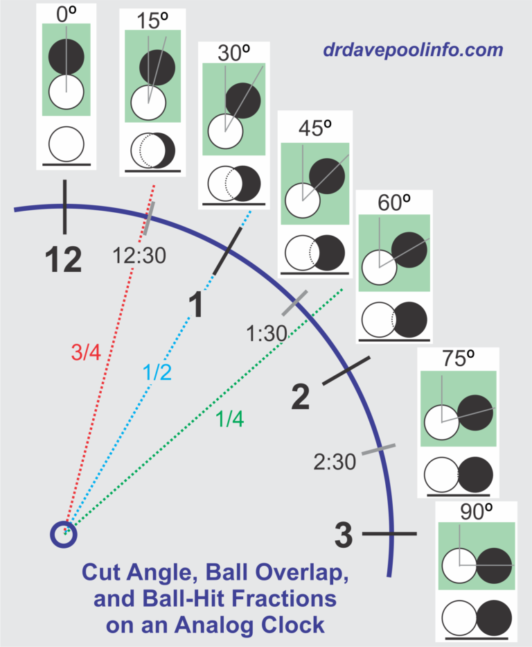Another related tidbit, maybe a more personal crutch, but still one I wish I’d seen somewhere before it occurred to me, is using clock face points on the outside upper quadrant of the OB as fractional-ball aiming targets. Assuming cutting to the left (shooting to the right of the OB), with 3:00 being the half-ball hit, aiming at 1:00 (30º from top) is exactly a 3/4 ball hit, and easier for me aim at than visualizing the half radius inside the ball. Similarly, 12:30 (15º) is close to 7/8, 1:30 (45º) close to 5/8, and 2:00 not far from 7/16 for what it’s worth. For thinner than 1/2 ball hits, I visualize an imaginary tangent ball next to the OB (which is easy as it’s right next to a real ball) and aim at clock points on its inside upper quadrant. 9:00 is a half-ball hit, 11:00 is exactly the 1/4 ball, 11:30 is close to 1/8, 10:30 (45º) is about 3/8, and 10:00 isn’t far from 9/16.