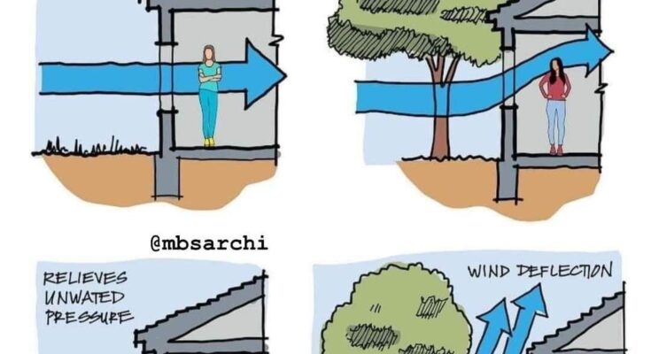 This detailed tutorial, inspired by principles from @mbsarchi, breaks down four key scenarios illustrating wind effects around simple structures (such as porches, verandas, or single-story buildings). Each diagram shows how wind interacts with the building—with and without vegetation—and demonstrates practical strategies for mitigation. These concepts are applicable to residential, commercial, and urban design projects, especially in windy regions like coastal areas, plains, or high-elevation sites.