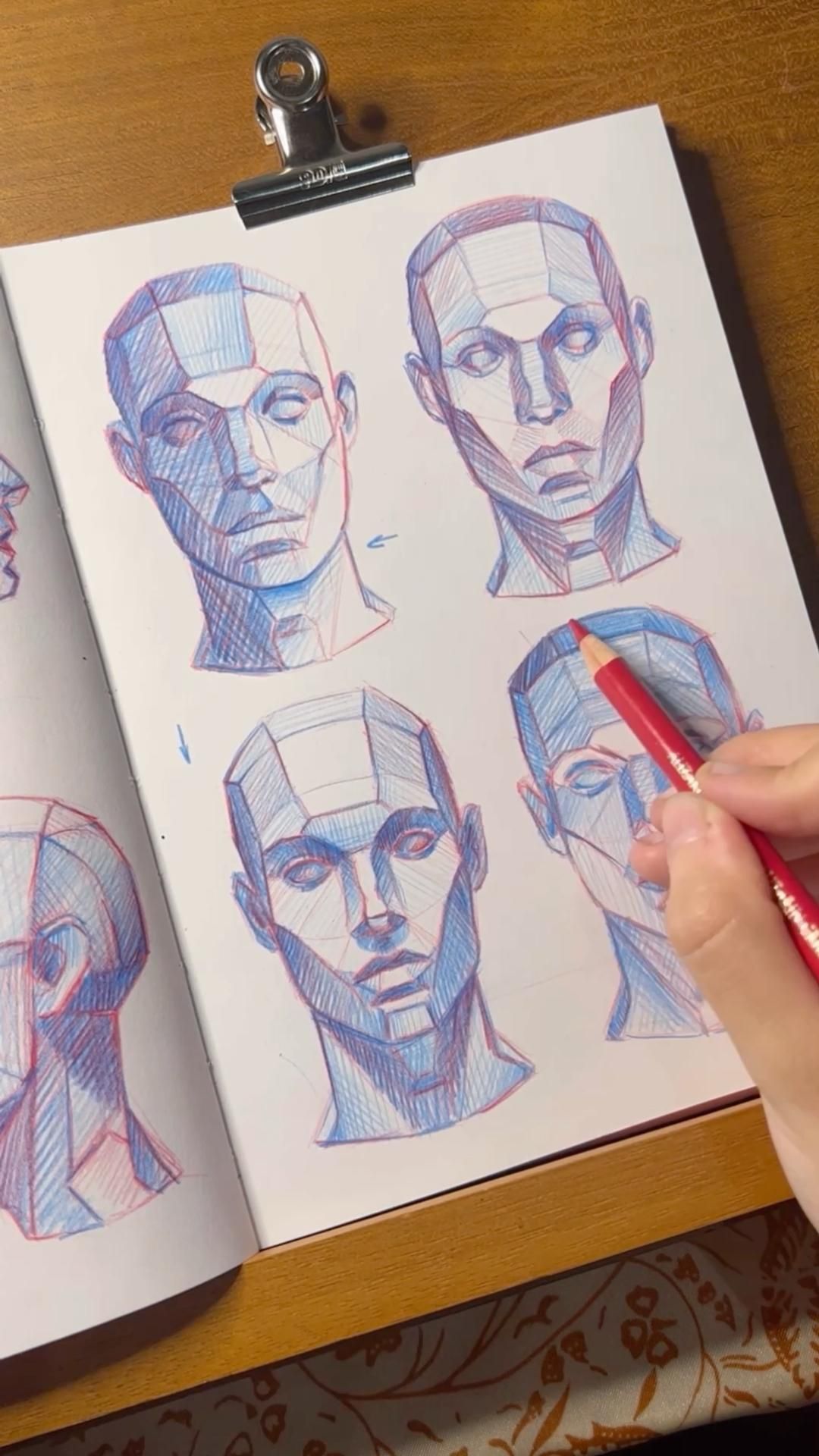 - For colored pencil (as in the red/blue image), layer blue for cool shadows, red for warm halftones to mimic skin undertones.
