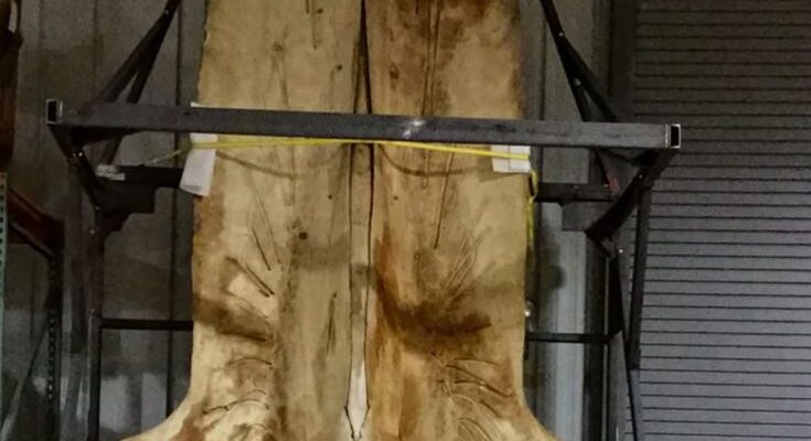 This powerful photograph documents a truly awe-inspiring moment in marine mammal curation: the enormous skull of an adult male sperm whale (Physeter macrocephalus), the largest toothed predator on Earth, secured on a custom steel support frame inside an industrial preparation facility or warehouse. The skull stands nearly upright in a dramatic V-shaped orientation, its two elongated, asymmetrical mandibular rami (lower jaw halves) forming towering, paddle-like blades that converge at the symphysis. The weathered, golden-brown bone surface shows natural staining, subtle cracks, and weathering marks from exposure and initial cleaning—hallmarks of a recently recovered or prepared specimen.