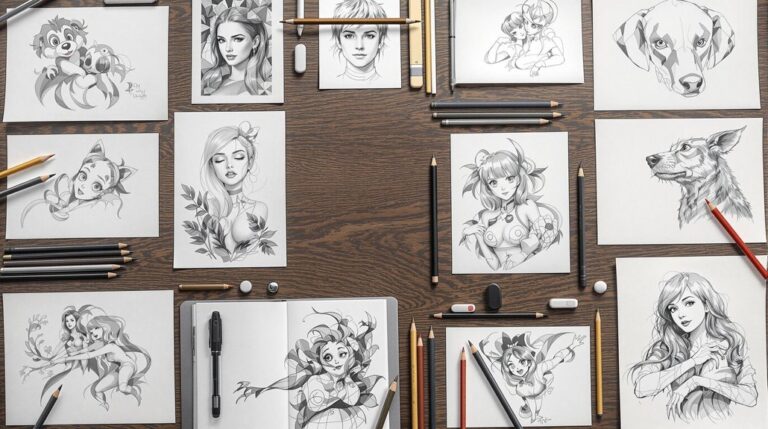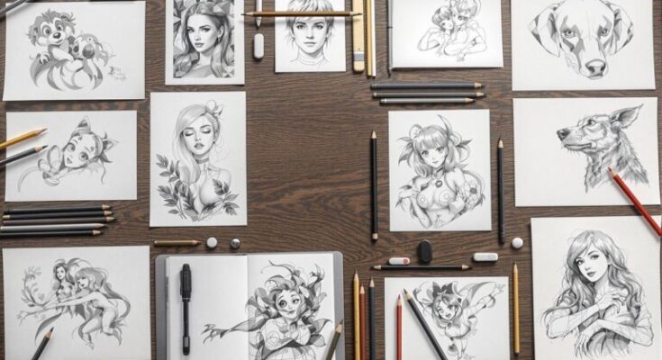 Pencil art pops with creativity—try sketching your favorite mug, goofy self-portraits, or wild cartoon characters with big, silly eyes. Draw a leaf’s twisty veins, a cat’s sleepy face, or the way sunlight falls on your messy desk. Challenge yourself with cross-hatching or mix pencil with watercolor splashes. Trace, layer, or go for minimalist lines if you’re feeling fancy. From magical creatures to bold skyline sketches, these ideas make every blank page a new adventure to explore next.