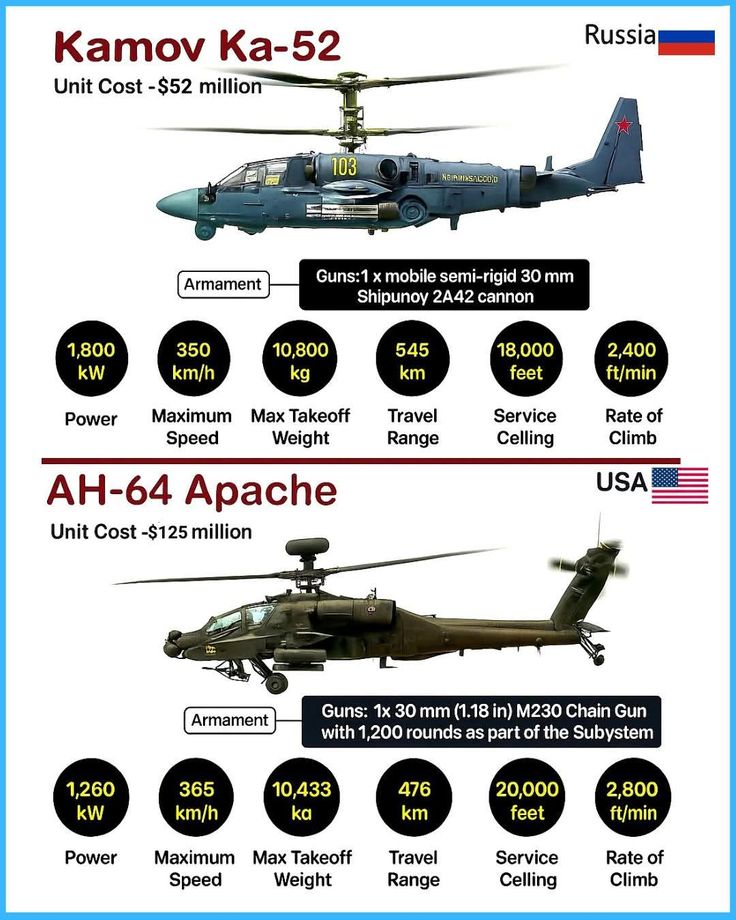 This high-contrast infographic delivers a clear, side-by-side technical comparison of two of the world’s most formidable dedicated attack helicopters: Russia’s Kamov Ka-52 Alligator and the United States’ Boeing AH-64 Apache (most commonly the AH-64E Guardian variant in frontline service). The layout uses profile views, national flags, unit costs, and circular stat badges to highlight key performance figures, armament details, and design contrasts at a glance.
