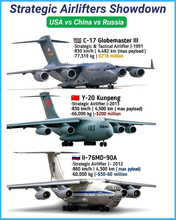 Notes: All support aerial refueling for extended range. C-17 leads in payload and short-field performance; Y-20 offers strong value and fleet expansion; Il-76MD-90A remains economical with upgrades.