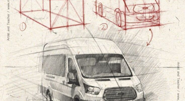 1. Draw Your Horizon Line: This is your eye level. Place it strategically based on your chosen viewpoint (low, mid, or high on the page). 2. Place Your Vanishing Points (VPs): Distance Matters: The further apart your vanishing points are on the horizon line, the less distorted your perspective will be. If they’re too close together, your car will look stretched or squashed, like using a wide-angle lens up close. A good rule of thumb is to place them outside the boundaries of your drawing surface initially, or at least significantly wider than your car’s width on the page. You can even tape extra paper to your drawing board to extend your horizon line and place VPs far apart. Symmetry and Angle: Consider the angle at which you want to view the car. If you want a more head-on, slightly angled view, one vanishing point will be closer to the center of your car sketch, and the other will be further away. If you want a more balanced 3/4 view, the vanishing points might be more equidistant from your central car sketch area. Experiment with placement! Vertical Lines:* Remember, in two-point perspective, all vertical lines (like the height of the wheels, windows, or doors) remain vertical and parallel to each other. Only the lines extending into depth converge to the vanishing points.