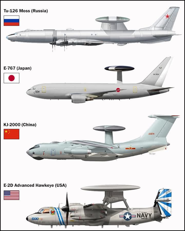 - Tu-126 Moss (top) – Soviet-era behemoth based on the Tu-114 airliner, with a large rotating rotodome and four powerful turboprops.