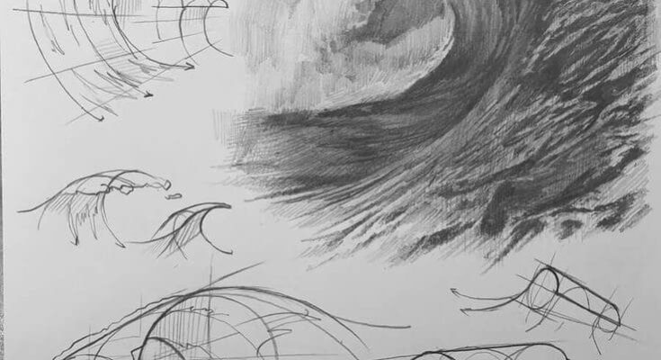 Pencil sketches of ocean waves with various perspectives and motion lines, accompanied by a pen on the side for drawing.