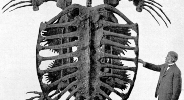 (The iconic historical photo of the Archelon skeleton on display, with a man in period attire touching the massive carapace for dramatic scale—exactly matching the image you shared.)