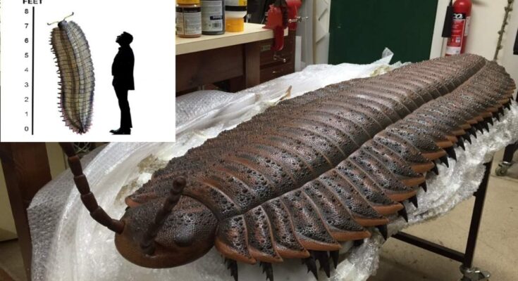 (Another impressive full-scale Arthropleura model laid out in a lab, wrapped in protective foam, with a height scale showing it reaches well over 8 feet—person silhouette for comparison makes the scale pop.)