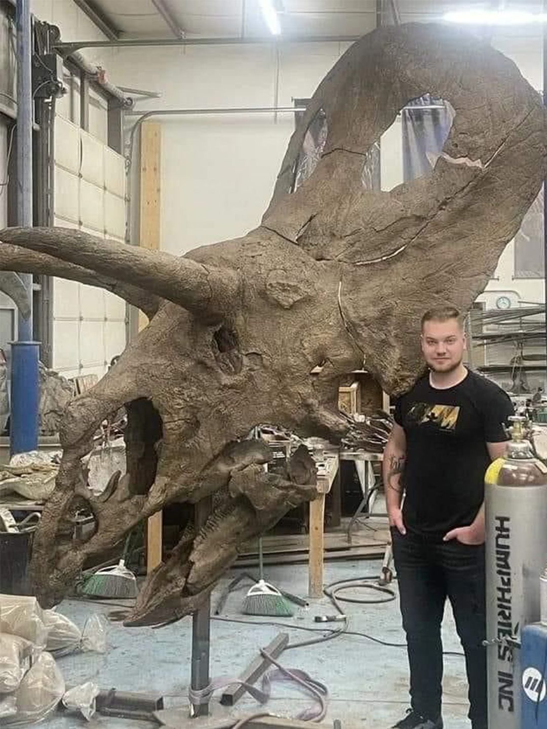 Massive Triceratops Skull: Human for Scale in the Workshop