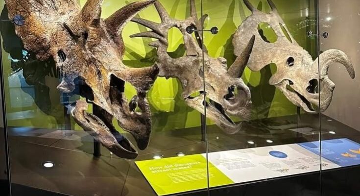 The skulls hang at eye level for maximum impact, their rough, fossilized textures contrasting beautifully with the modern museum lighting and glass cases. It’s a perfect example of how museums use comparative displays to highlight evolutionary diversity within a single dinosaur group.
