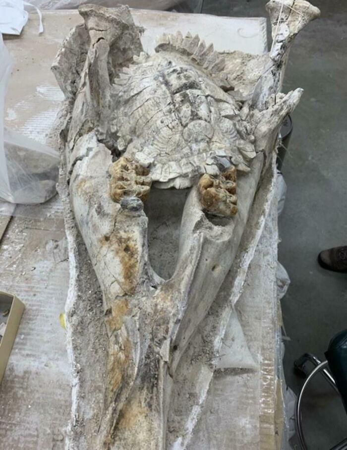 The Predator: The elongated, heavy skull surrounding the turtle belongs to an ancient crocodilian. You can clearly see the thick, reinforced bone of the snout and the sockets where massive teeth once sat.
