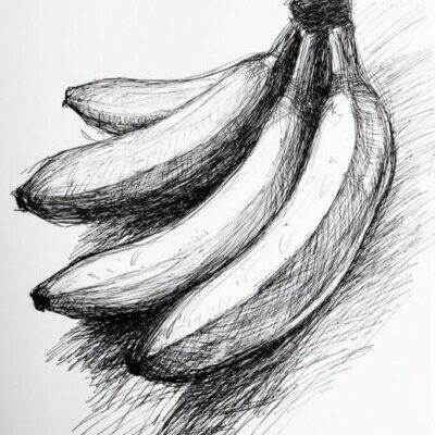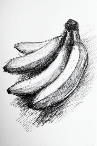 Sketch of a banana bunch on white background, hand-drawn in pen; artistic fruit illustration.
