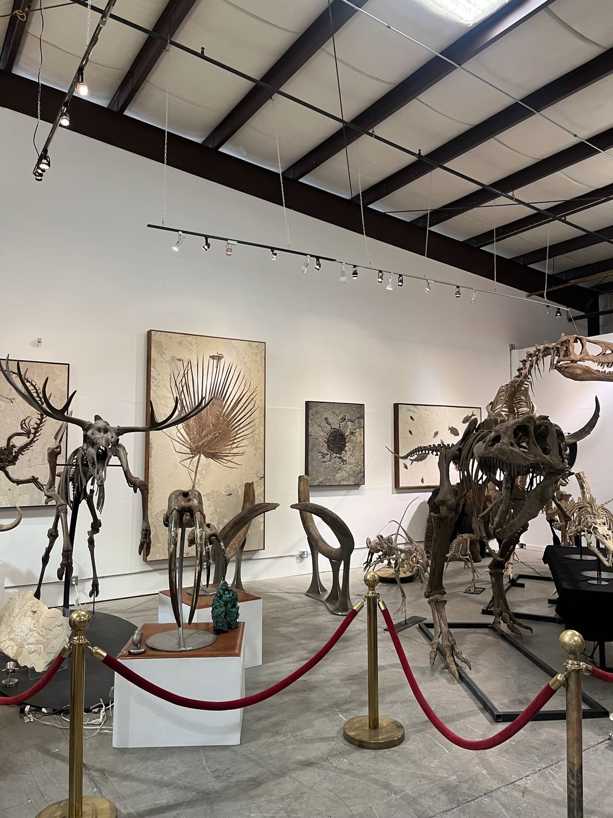 Given the San Francisco location, warehouse aesthetic (exposed beams, industrial lighting), red ropes, and mix of fossils with large contemporary art, this closely resembles a private fossil gallery, high-end paleo dealer showcase, or specialized pop-up event in the Bay Area. Places like Paxton Gate (known for oddities including fossils) or boutique paleo shops sometimes host such displays, though the scale and mounted skeletons point to a dedicated paleo-art or collector’s venue. Major institutions like the California Academy of Sciences or UC Museum of Paleontology have more formal halls, but this raw, gallery-like feel suggests a commercial or private exhibition space—perhaps a temporary install or ongoing collection open to visitors.