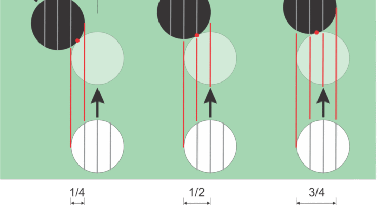 To use Fractions for aiming you need to get familiar with (learn to visualize at the table) the cut angles formed by the three common fractional overlaps: 3/4, 1/2 and 1/4 ball. To help with that, here’s a practice setup diagram of the fractional cut angles (left and right) for shots parallel with the short and long rails.
