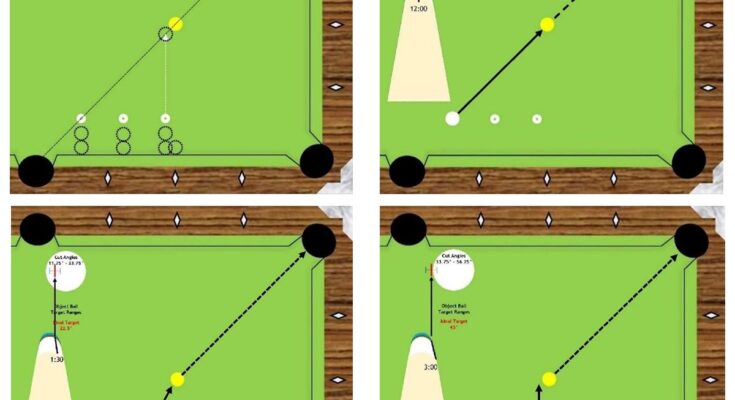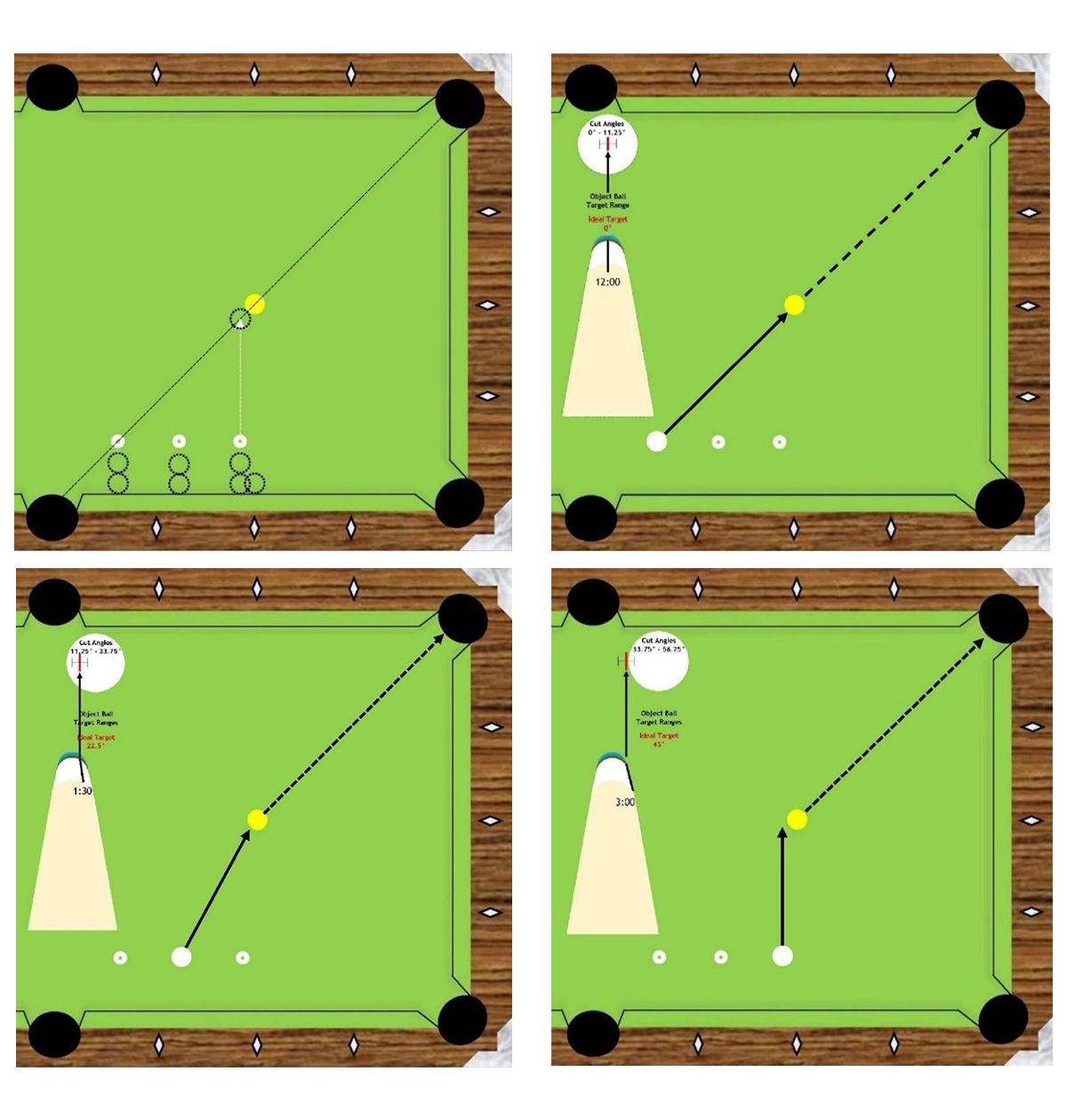When using the 12:00 o’clock position the range of geometric cut shots is 0° to 11.25°. The 10:30 & 1:30 positions relate to the range 11.25° to 33.75°. Finally, the 3:00 & 9:00 positions related to the range 33.75° to 56.25°. A more easily accessible set is for anything less than 12° use the 12:00 sighting. For 12°-30° use the 10:30 or 1:30 sightings, and for 30° to 45° use the 9:00 or 3:00 sightings. (Video 8:44)