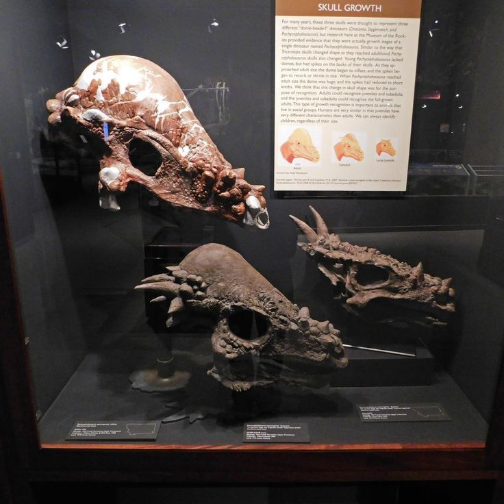 Museum displays, such as the one at the Museum of the Rockies in Bozeman, Montana, serve as educational portals to prehistoric life. The featured exhibit, titled “Skull Growth,” presents three fossilized skulls in a glass case, each representing a different ontogenetic stage of Pachycephalosaurus wyomingensis. Accompanied by an informative placard, the display explains the historical misinterpretation and the current scientific consensus.