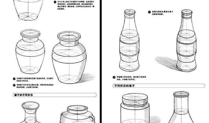 2. Incorporating Transparency and Reflections: In glass bottles, imply thickness with inner contours parallel to the outer (as in the shaded examples). Annotations like “透明材质表现” (transparent material expression) suggest subtle internal lines for liquid levels or refractions. Add cast shadows: elliptical ovals beneath, elongated based on light direction.