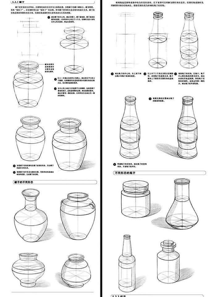 In the field of still life drawing and object rendering, mastering the depiction of everyday vessels like vases, bottles, and jars is crucial for developing skills in perspective, proportion, and volume. This comprehensive tutorial is based on a detailed reference illustration from a Chinese art instructional page (likely from a book or online resource, with annotations in simplified Chinese), which demonstrates systematic approaches to constructing symmetrical, three-dimensional forms using basic geometric shapes such as circles, ellipses, cylinders, and axes. The image is laid out in a vertical two-column format: the left column focuses on rounded vases and pots with progressive complexity, while the right column emphasizes elongated bottles and laboratory-style flasks, incorporating shading for depth. Each example includes construction lines (e.g., center axes, horizontal guidelines, and elliptical cross-sections) to guide the building process from rough sketches to refined, shaded finals.