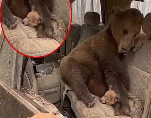Inside, a large figure sat still in the driver’s seat. It was a mother bear, hunched over the lifeless body of her cub. Her fur was singed, her breathing labored, and her eyes met his with a depth of emotion that felt almost human: grief, pain, and exhaustion. The cub lay at her feet, small and motionless, covered in ash. Firefighters would later confirm it likely died of smoke inhalation during the chaos. But instead of fleeing, the mother had carried her baby to the nearest shelter she could find — the car — and sat there.