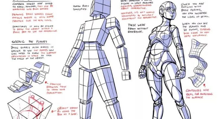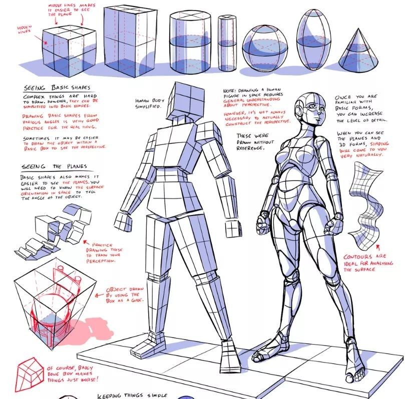 Understanding the human body as a collection of basic geometric shapes and planes is the cornerstone of accurate figure drawing, allowing artists to simplify complex forms, maintain correct proportions, and achieve convincing three-dimensionality. This in-depth, professional-grade tutorial is directly based on a highly detailed reference sheet titled “Seeing Basic Shapes” and “Seeing the Planes”, which breaks down the human figure into cubes, cylinders, spheres, and cones—then reconstructs it into a fully realized, anatomically sound form. Rendered in clean pencil lines with subtle shading, the image features two robotic-like figures (one male, one female) built from simplified volumes, alongside isolated 3D primitives (cube, cylinder, sphere, cone) and annotations in red and black. Key concepts include middle lines for symmetry, plane orientation, contour idealization, and volume perception, all illustrated with practical examples and warnings against common pitfalls.
