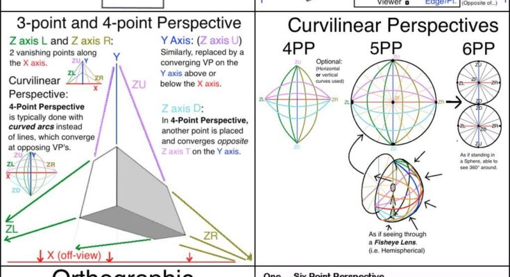 Whether you’re a beginner tackling basic boxes or an advanced artist exploring 360° spherical projections, follow the annotated infographic above to build spatially accurate drawings from any viewpoint. Includes orthographic projections for technical precision and curvilinear methods for panoramic dynamism.