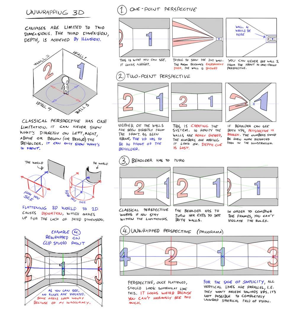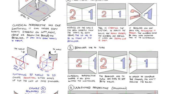 Perfect for illustrators, concept artists, and animators, this guide reveals how to compensate for the third dimension’s absence on a 2D canvas, whether you’re sketching interiors, characters, or panoramic landscapes. Dive into the annotated illustrations above for a step-by-step mastery of depth and distortion.