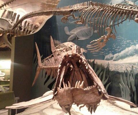 Dunkleosteus provides critical insights into the evolution of jawed vertebrates and the diversification of marine ecosystems during the Devonian. Its biomechanical adaptations are studied using finite element analysis to model bite forces, while its armored structure informs research on early vertebrate defense mechanisms. The museum display, with its educational backdrop, serves as a resource for paleontology students and the public, illustrating the complexity of ancient marine food webs.