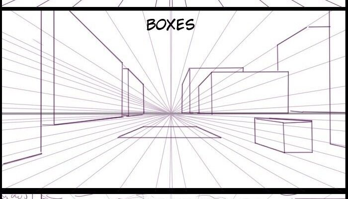 - With the grid in place, start adding basic three-dimensional shapes, such as boxes, to define the spatial layout. Position these boxes along the converging lines, ensuring their sides align with the grid’s perspective. The “Boxes” image illustrates how to place rectangular forms at varying distances from the vanishing point, creating a sense of recession. Adjust the size and angle of the boxes to reflect their proximity to the viewer, with larger shapes in the foreground and smaller ones toward the vanishing point.