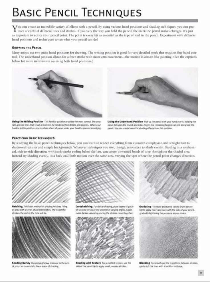 • Mastering shading is key to adding depth and dimension to your drawings. Study the following techniques to render a variety of textures and tones: