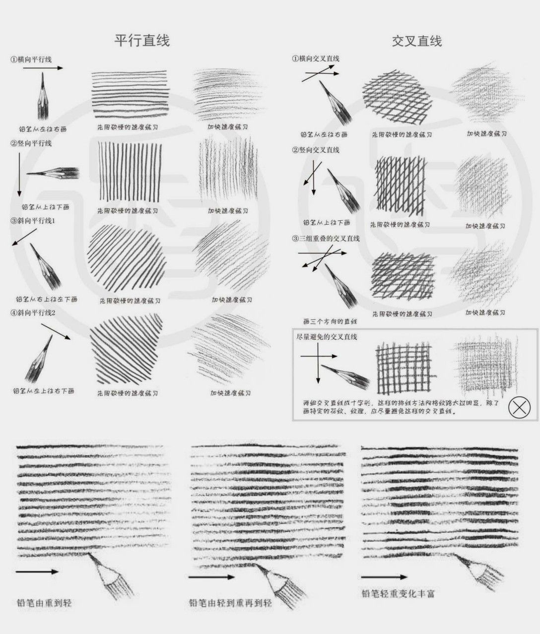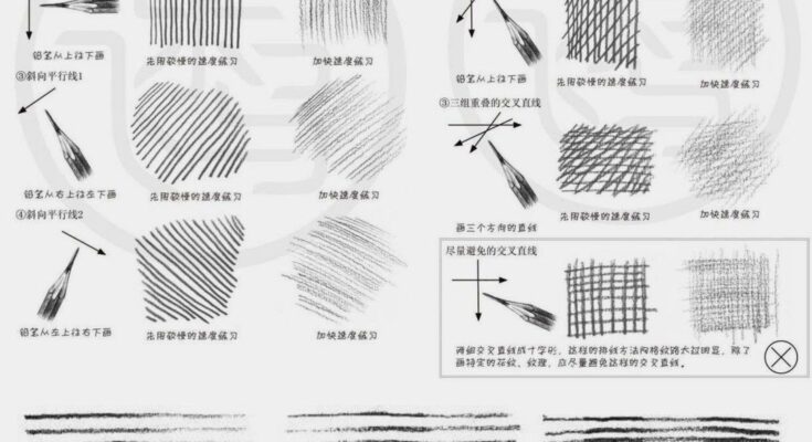 Unlock your artistic potential with our in-depth tutorial on mastering pencil shading techniques, a cornerstone skill for creating realistic and textured drawings. Pencils are a versatile tool, and by mastering various shading methods, you can achieve a wide array of effects to enhance your illustrations. This guide offers a detailed, step-by-step exploration of shading techniques, divided into “平行直线” (Parallel Lines) and “交叉直线” (Cross Lines) as illustrated in the provided images. Suitable for artists of all levels—beginners to professionals—this tutorial will help you refine your pencil work and bring depth to your artwork.