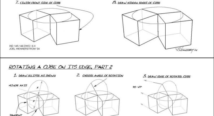 Unlock the secrets of advanced perspective drawing with our comprehensive tutorial on rotating a cube on its edge, a key technique for creating dynamic and realistic three-dimensional illustrations. This guide, divided into two parts, provides a detailed, step-by-step process to help artists of all levels master the transformation of a cube using ellipses and vanishing points. Illustrated with the provided images by Joel Wennerstrom, this tutorial is perfect for illustrators, designers, and animators looking to enhance their spatial drawing skills. Gather your pencils, rulers, and paper, and let’s dive into the process.