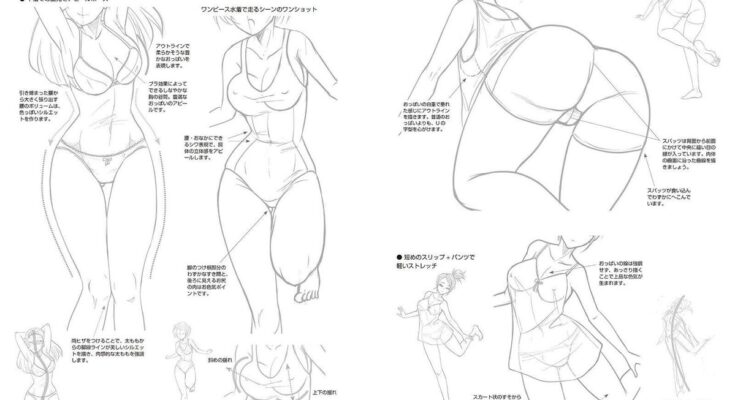 The tutorial addresses the challenge of drawing clothing on the female form, with examples ranging from minimal coverage like bikinis to loose-fitting dresses. The image includes detailed notes on fabric folds, such as how they drape over the hips or bunch around the thighs, influenced by the body’s contours and the pose’s tension. Techniques for shading and highlighting are explored, with suggestions to use light hatching for soft fabrics and bolder strokes for structured materials, ensuring a realistic texture that complements the underlying anatomy.