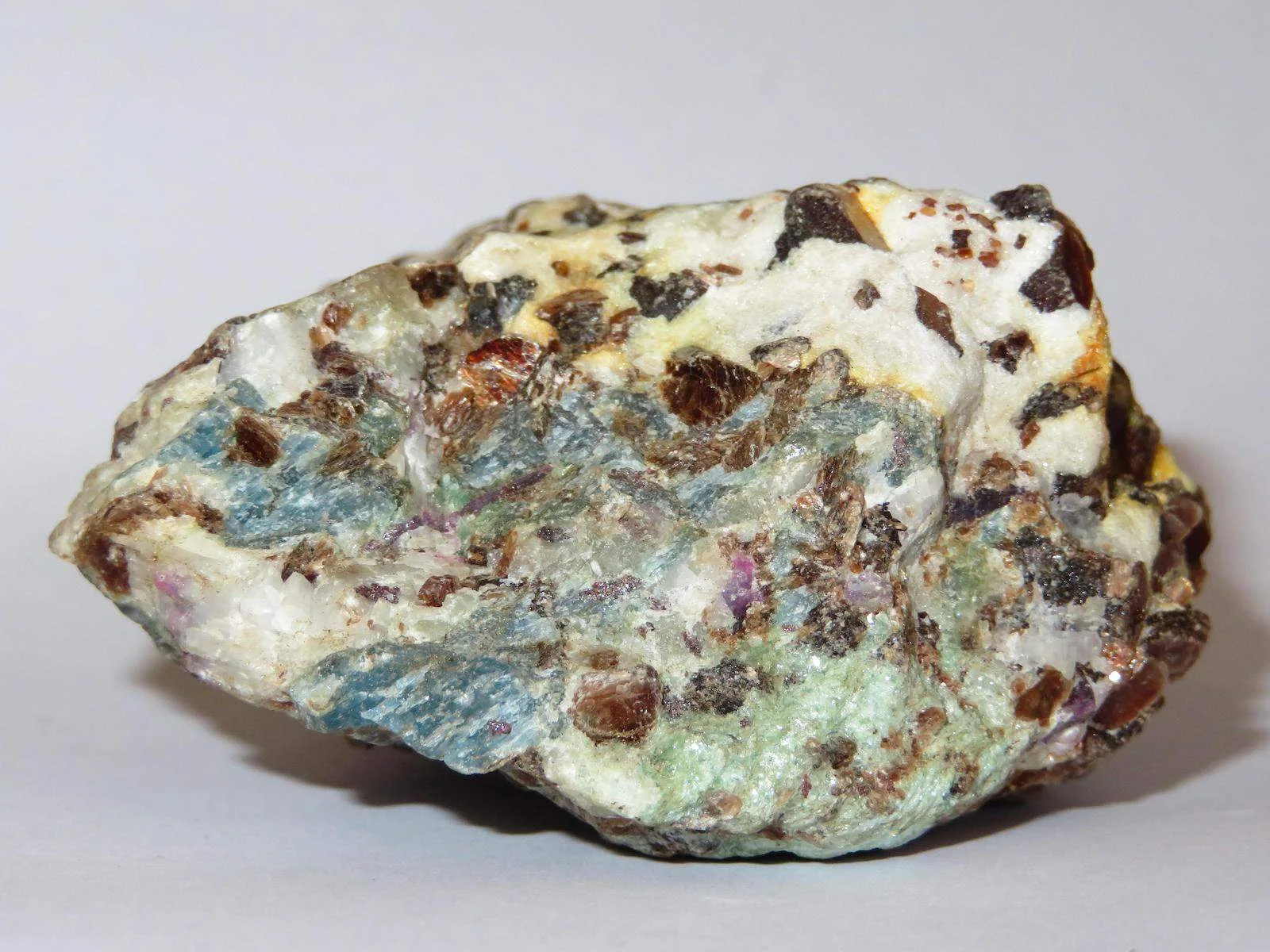 | Pegmatite: White Plagioclase, Brown Biotite, Blue mineral Kyanite |